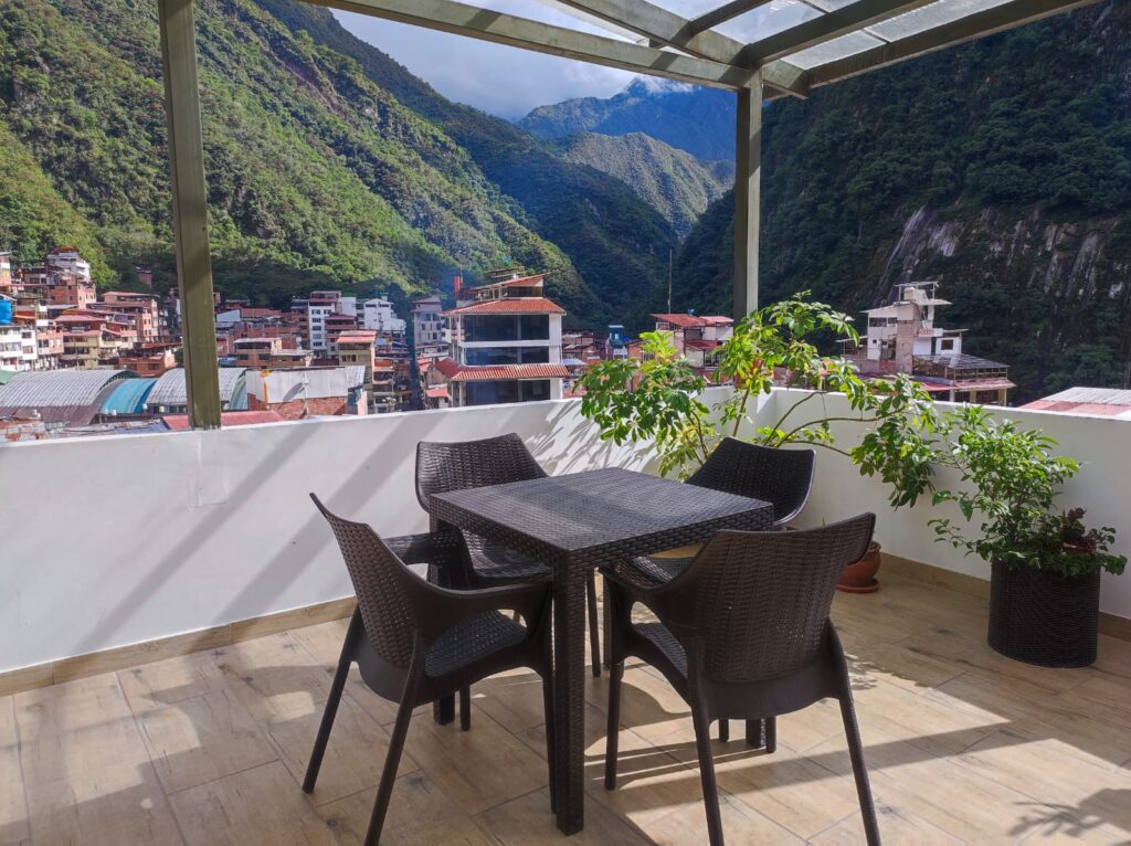 La vista desde la terraza acompaña cada pausa, creando el espacio ideal para descansar cerca de Machu Picchu.